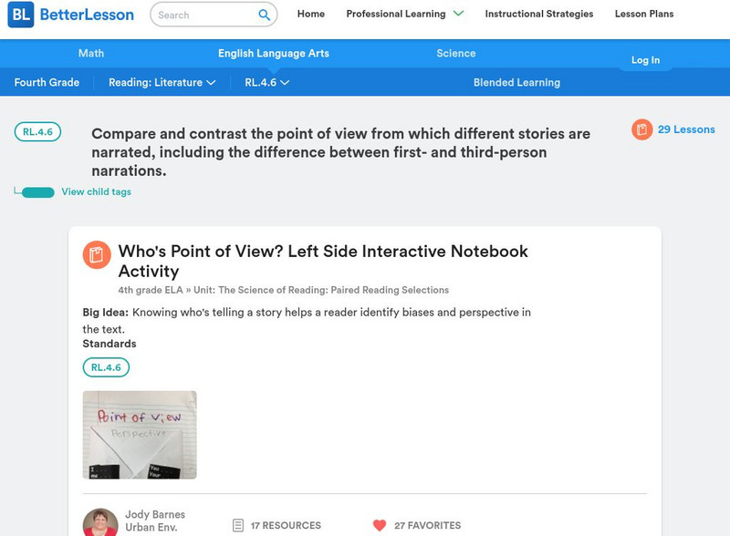 Links to 29 lessons and activities that build student skills in standard RL.4.6: Compare and contrast the point of view from which different stories are narrated, including the difference between first and third person narrations.