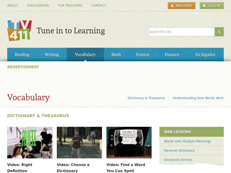 Fifteen short videos that help students learn about vocabulary building skills such as using a dictionary, using a thesaurus, multiple meaning words, synonyms, antonym, homonyms, prefixes, suffixes, and more.