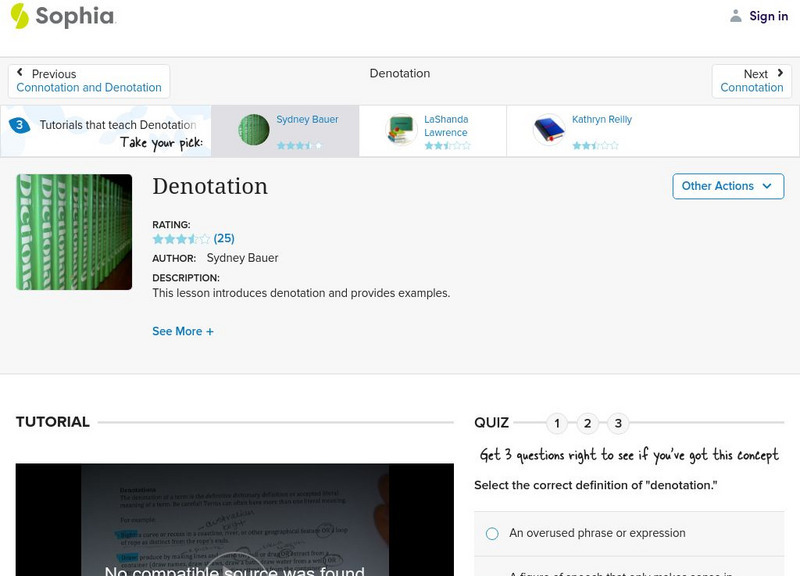 This video lesson introduces denotation and provides examples. It is 1 of 3 in the series titled "Denotation." [2:54] L.9-10.5b nuances, L.11-12.5b Nuance