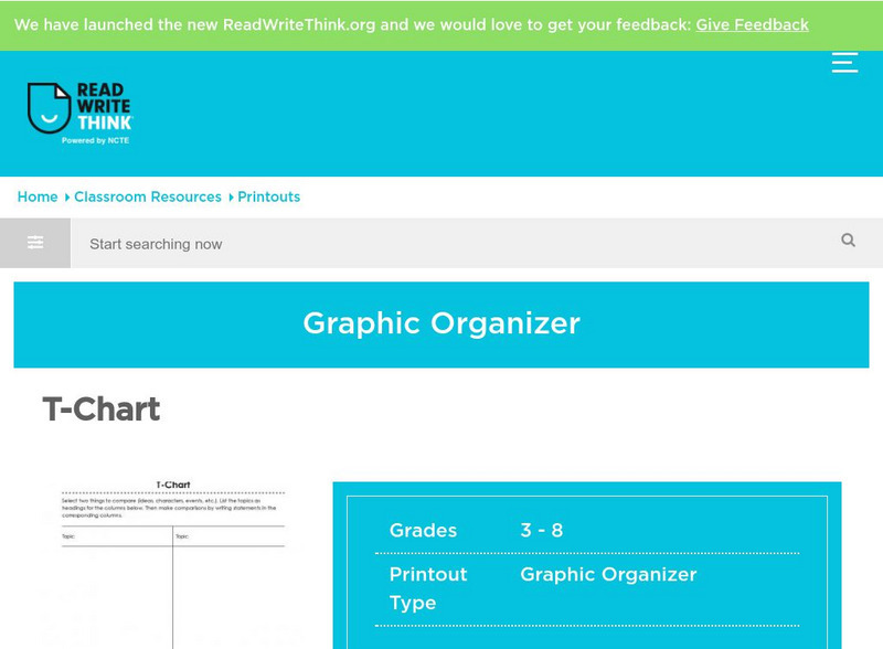 A printable T-chart for students to use when comparing two topics or two sides of one topic. Directions on how to use this graphic organizer as well as lists of teaching ideas and related resources are also provided.