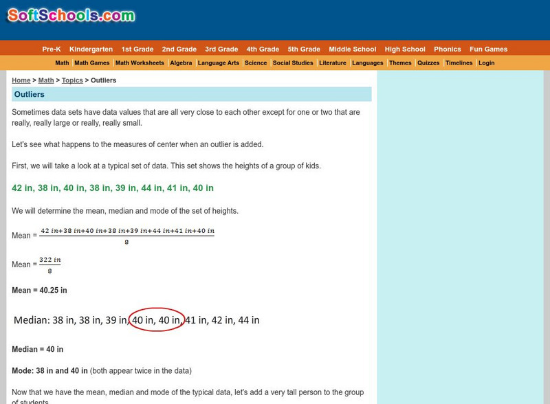 On this websites students explore the concept of outliers. Students are given several data sets and investigate how outliers can effect the mean and median of a data set.