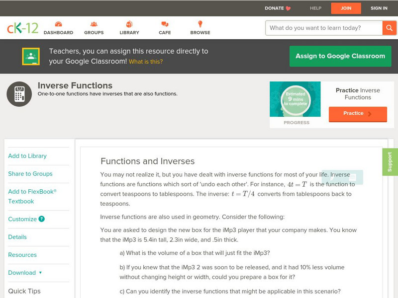 [Free Registration/Login may be required to access all resource tools.] In this lesson students are provided with an introduction to inverses of functions. Students examine guided notes, review guided practice, watch instructional videos...