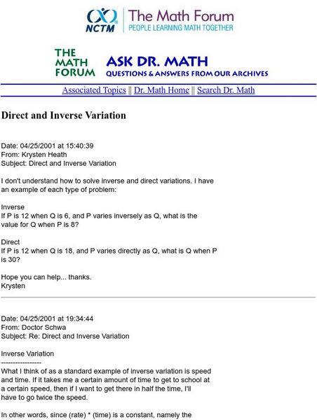 Dr. Math gives hints of how to solve a problem with inverse and direct variation. The site includes how inverse and direct variation problems are set up using initial and final conditions. The student can then solve for the unknown. A...
