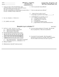 In this acceleration worksheet, high schoolers solve 14 problems including finding work done on an object, the speed of an object, the distance traveled and the acceleration.