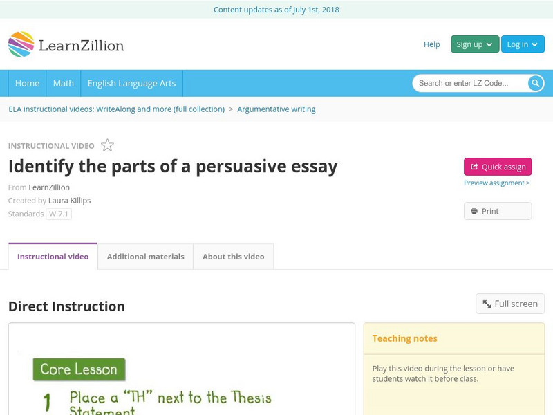 Learn Zillion: Identify the Parts of a Persuasive Essay