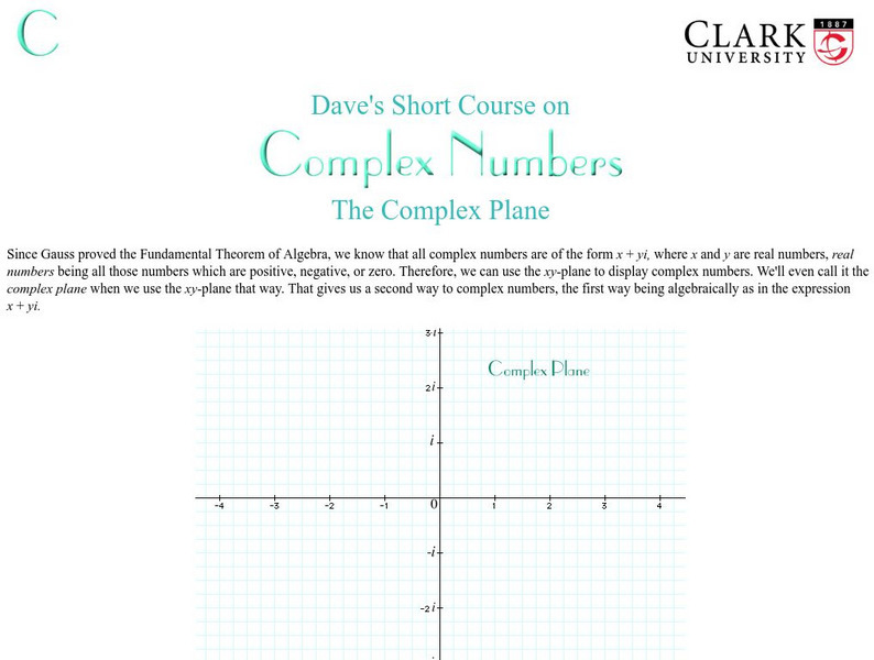 This website provides an in-depth lesson on complex numbers. You learn about simplifying, adding, and multiplying complex numbers by viewing example problems that are worked through step-by-step. Continue on to pages 2 and 3 which...