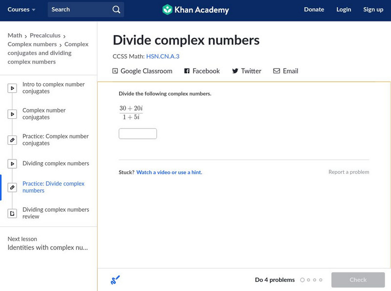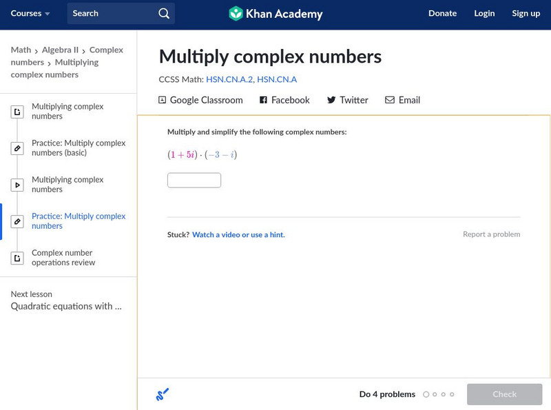 [Free Registration/Login may be required to access all resource tools.] This lesson covers multiplying and dividing complex numbers. Students examine guided notes, review guided practice, watch instructional videos and attempt practice...