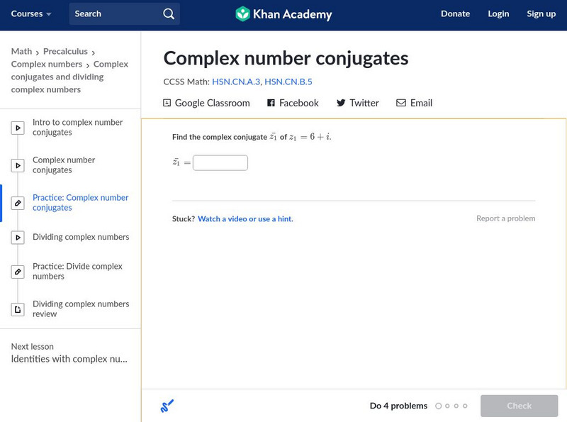Given a complex number, find its conjugate or plot it in the complex plane. Students receive immediate feedback and have the opportunity to try questions repeatedly, watch a video or receive hints.