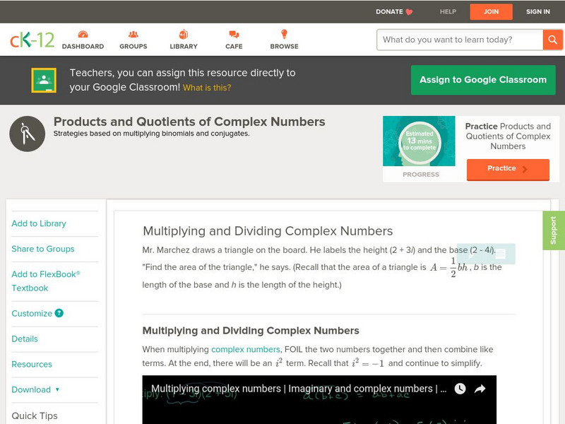 [Free Registration/Login may be required to access all resource tools.] A collection of resources for learning about and practicing how to multiply and divide complex numbers.