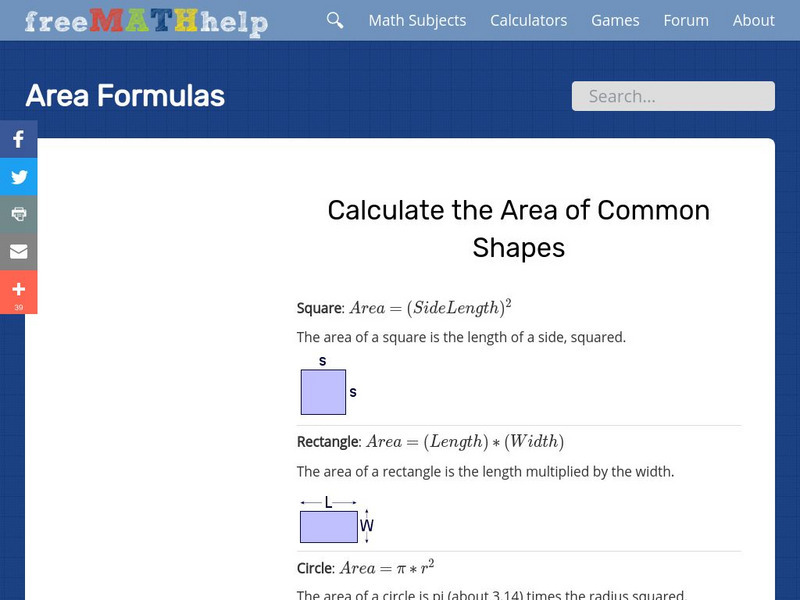 Find a quick, concise explanation of area and the formulas for different shapes. An example is given to help you understand how find the area of a shape. The area formulas are listed for different types of shapes.