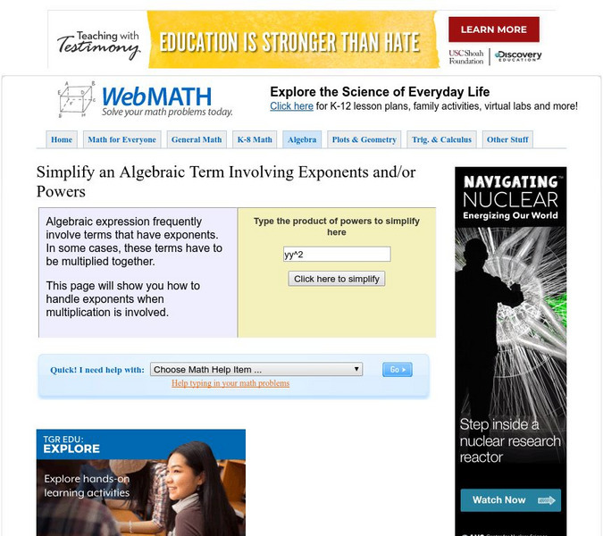 This WebMath site offers assistance with simplifying algebraic terms involving exponents or powers.