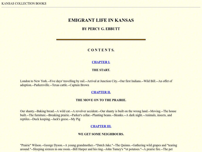 This site is a textual copy of a book written by an Englishman, Percy G. Ebbutt entitled Emigrant Life in Kansas, published in 1886. The book focuses on a young man's experiences on the prairie in Kansas. Written for an English audience.
