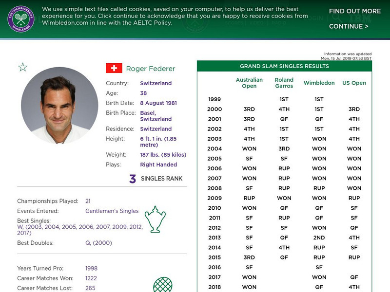 Information about Roger Federer, with a profile, news articles, photos, videos, interviews, game results, and player statistics.