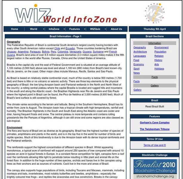 Students can review Brazilian history starting in the 16th century, learn about the geography of the four different regions and hear the national anthem of Brazil. Includes a great deal of information about all aspects of living and...