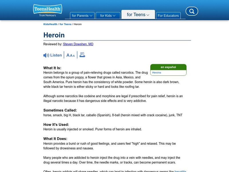 Use this chart from Kids Health as a quick reference to information about heroin. Find out how it is used, what it's called, where it comes from, and what it does to your body.