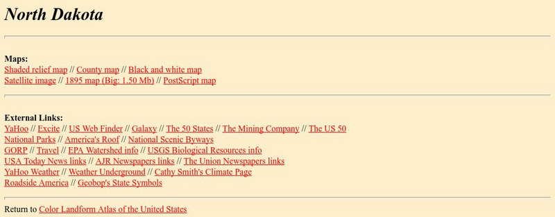 Six maps are included on this site, including a shaded relief map, and a historical map from 1895 of North Dakota. Links to other ND sites are also provided.
