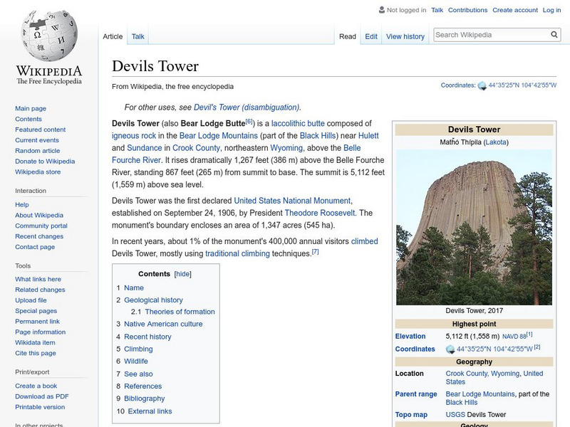 Both geological and historical aspects of the Devils Tower National Monument in Wyoming are covered on this website.