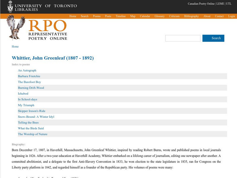 This site provides links to twelve of Whittier's most widely-read poems, including "Snow-Bound, A Winter Idyl," "Barbara Frietchie," "Ichabod," and "The Worship of Nature." Also includes a brief biography.