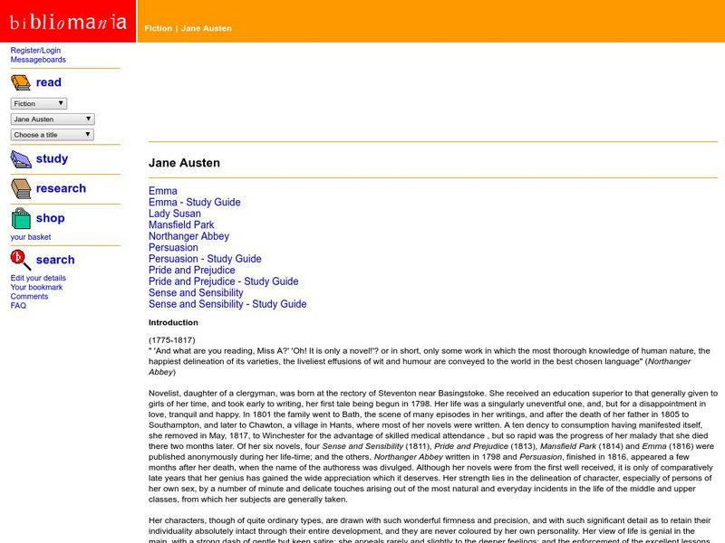 At this website, access full texts of "Emma," "Lady Susan," "Mansfield Park," "Northanger Abbey," "Persuasion," "Pride and Prejudice," and "Sense and Sensibility." Also provided is a brief write-up on the life and career of Jane Austen,...