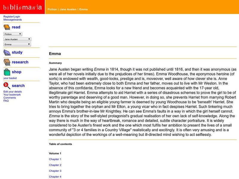 This website provides the full text of Jane Austen's novel, "Emma." Also included is a brief paragraph with information on the novel's context, main characters, and major events.