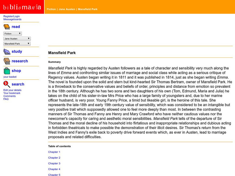 At this website, read the full textr of Jane Austen's "Mansfield Park." Novel's chapters are preceded by a brief paragraph introcuding the novel, its characters, and its major events.