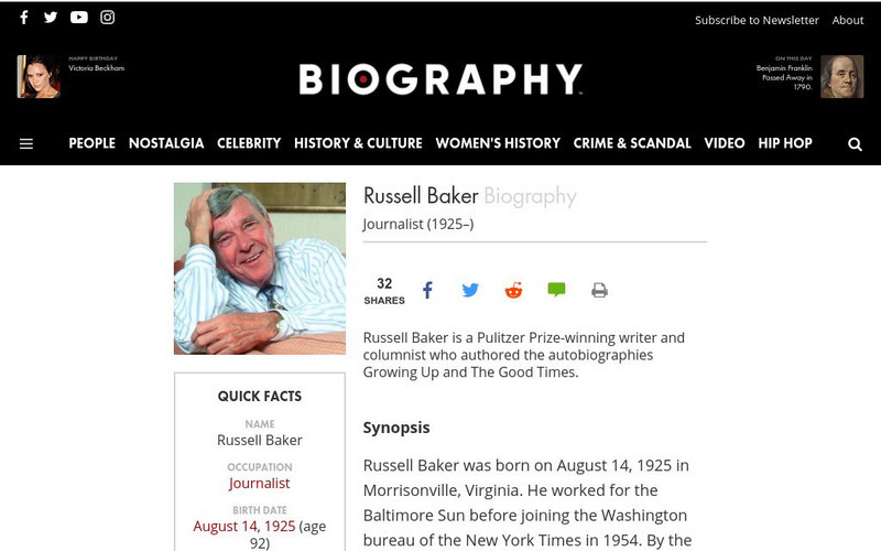 A brief biography of the Pulitzer Prize-winning author, Russell Wayne Baker.