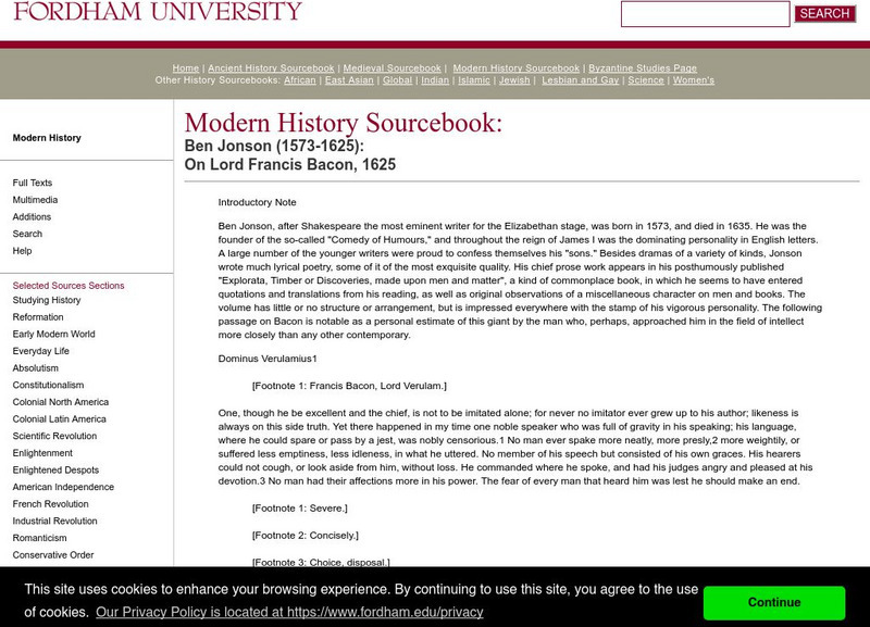 This site from the Modern History Sourcebook of Forham University provides a brief biography of Jonson and an excerpt by Jonson on Lord Francis Bacon.