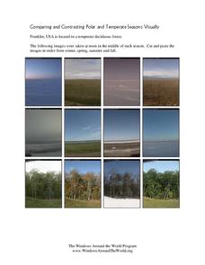 In this seasons worksheet, students cut and paste 12 pictures into seasonal order. Students compare pictures from Massachusetts, Canada, and the Arctic Circle.