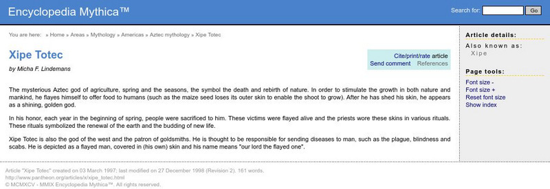 This site is a brief article from the encyclopedia Mythica, and contains information on the Aztec god, Xipe Totec. The article is three paragraphs long and contains great background information into the subject.