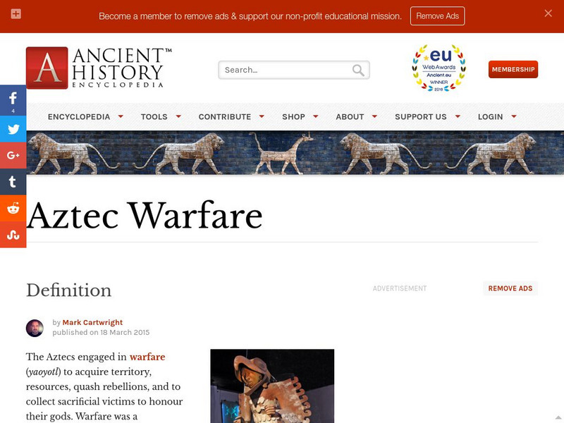 Illustrated encyclopedia entry takes a look at Aztec warfare. It examines their weapons, armour, strategies, 'flowery wars', and the collapse of the Aztecs.