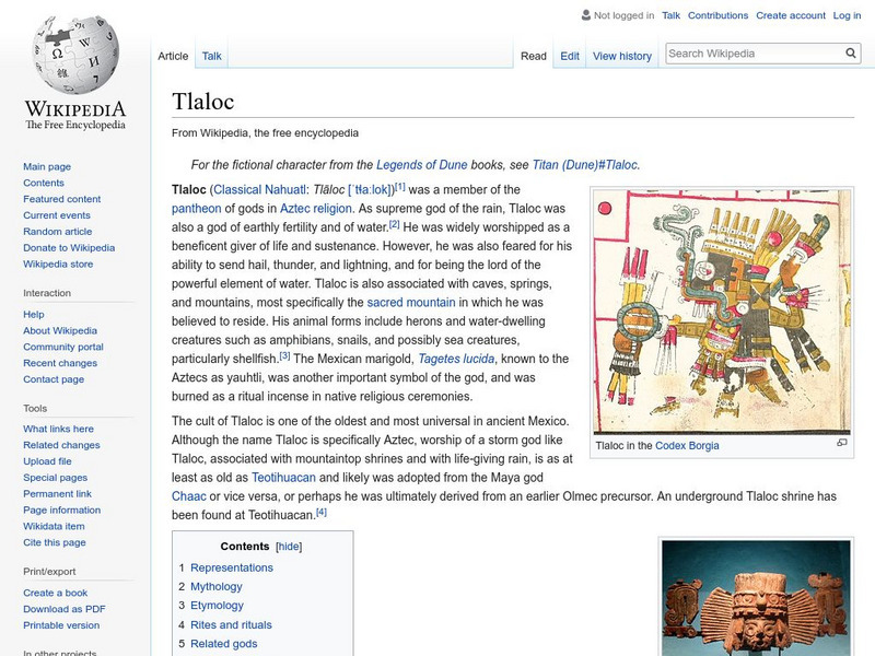 This site from the free encyclopedia Wikipedia contains brief but informative information on the Aztec god, Tlaloc. Great for background knowledge on the subject.