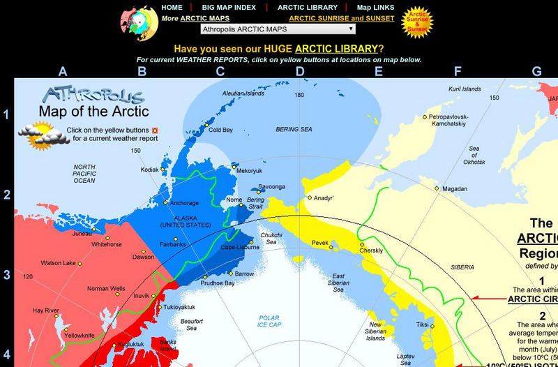 This is a useful map for orienting students to where the Canadian Arctic lies in relation to other Arctic countries. The centre of the map is the North Pole. Clicking on the map brings up weather reports for various locations.