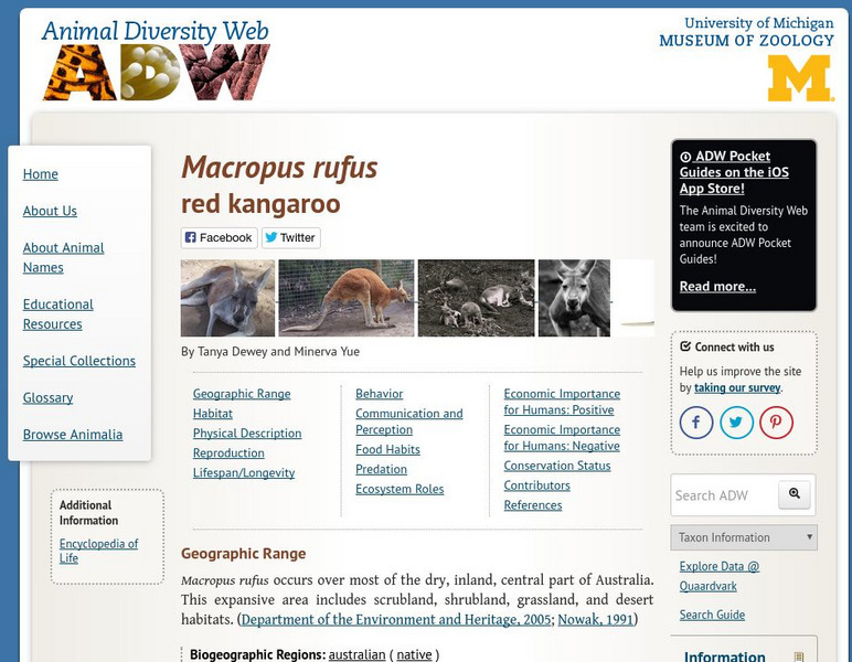 The Animal Diversity Web offers a page on the Macropus Rufus, or Red Kangaroo. Includes all kinds of information from behavior to history. Use the table of contents for easy navigation.