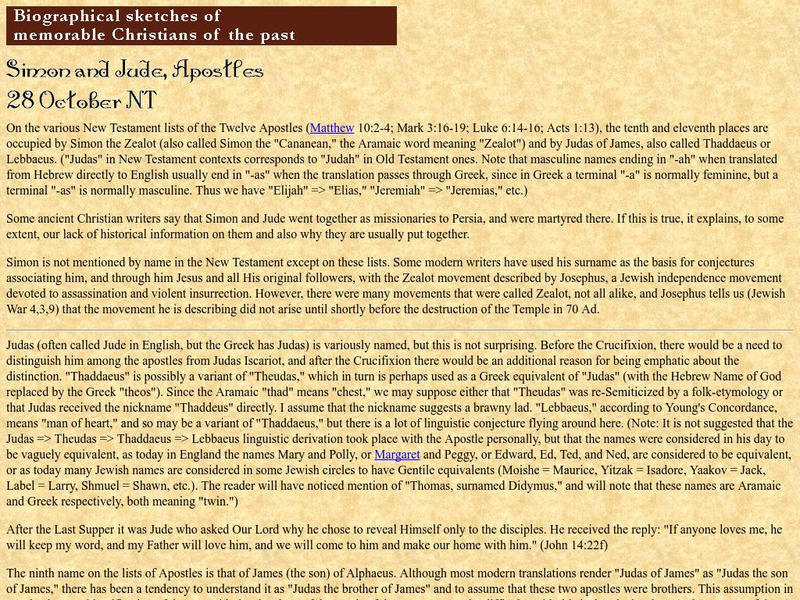 This site gives some information on the apostles St. Simon the Zealot and St. Jude. Although not much is known about either of these men, there is some general information here, as well as Scripture references.
