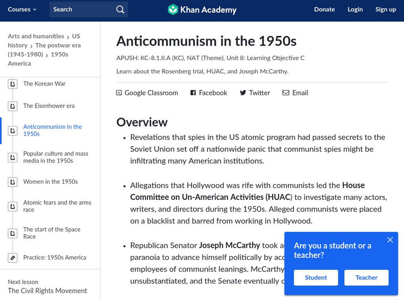 A learning module that begins with "McCarthyism" by USHistory.org, accompanied by guided reading questions, assessment questions, and discussion questions. The text can be printed as a PDF or assigned online through free teacher and...