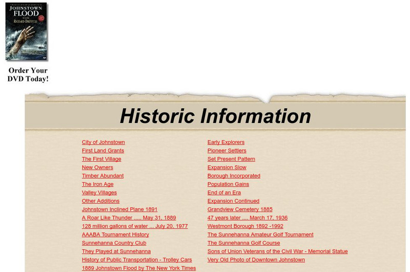 Historic information on the town of Johnstown before the flood, during the flood, and after. Click on "A Roar Like Thunder, May 31, 1889" to read an account of the flood itself.