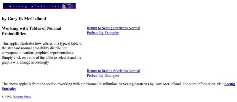 The Applet illustrates how to use the old-fashioned tables of normal probabilities and areas under the normal distribution cureve to arrive at corresponding graphs of the areas. A good resource for the topic.