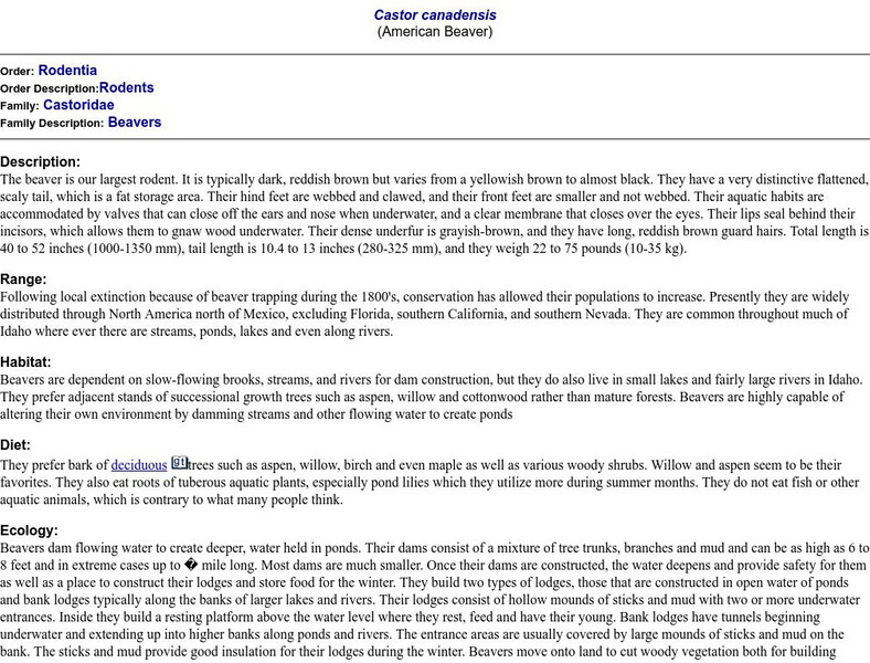 Come and check out this site about beavers. It features information on the characteristics, range, habitat, reproduction, range, food and more of this fascinating rodent.