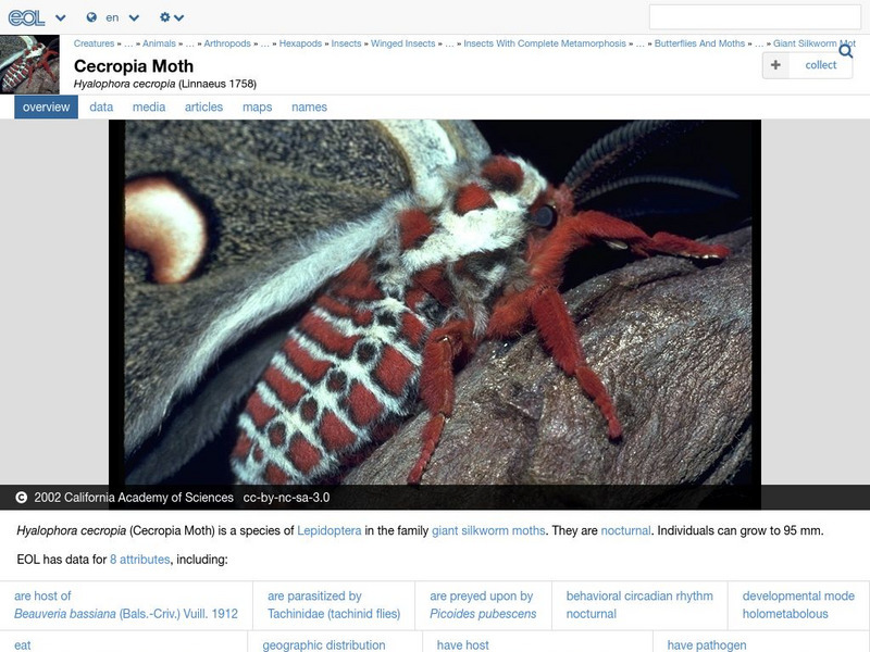 This site created by NatureWorks focuses on the Cecropia Moth. The content of this resource includes a look at this species' characteristics, range, habitat, food, and more.