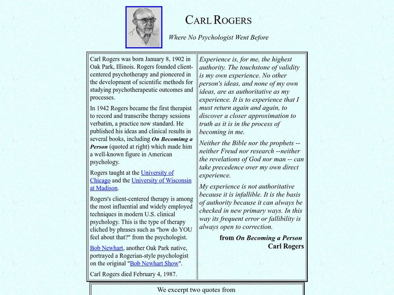 A profile of psychotherapist Carl Rogers that surveys his life and theory of client-centered therapy. Provides several important biographical details, as well as charts and maps about Rogers' theories.