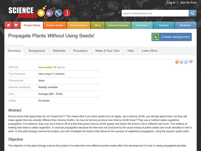 This plant biology science fair project that explores factors involved in successful propagation of plants using plant division instead of seeds. The Science Buddies project ideas are set up consistently beginning with an abstract,...