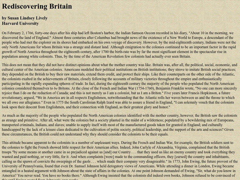 Students examine events that occurred and explore the differing sentiments between the British and American colonists in the years leading up to the American Revolution. They view and discuss a video on the events then analyze quotes...