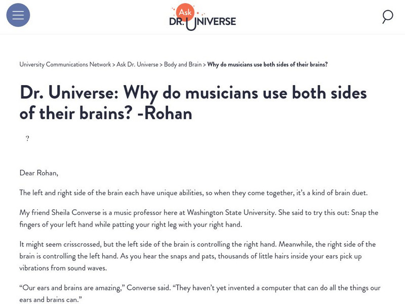 Website using a question-answer format in which Dr. Universe attempts to answer a curious question a student has about why musicians use both sides of their brains.
