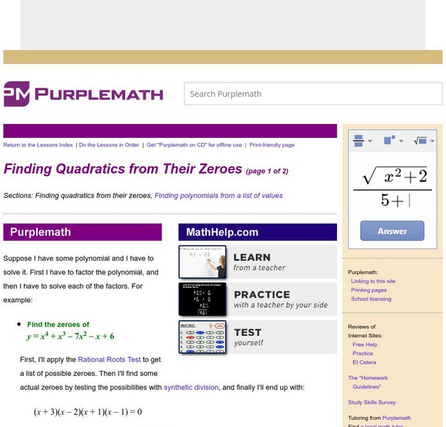 Purplemath explains the Remainder Theorem and gives examples using synthetic division to evaluate, determine if a value is a solution/zero. The lesson contains a link to synthetic division and other related terms.