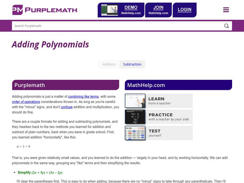 Demonstrates how to add polynomials using both the horizontal and vertical formats.