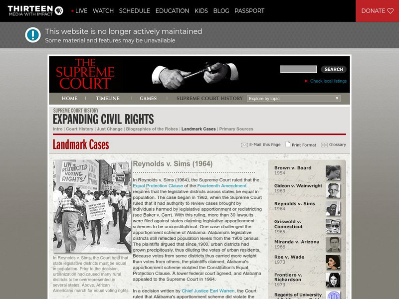 PBS provides a synopsis of the landmark Supreme Court case of Reynolds v. Sims, the Alabama reapportionment case in which the Court reaffirmed the principle of one person, one vote. Decision was written by Chief Justice Earl Warren.