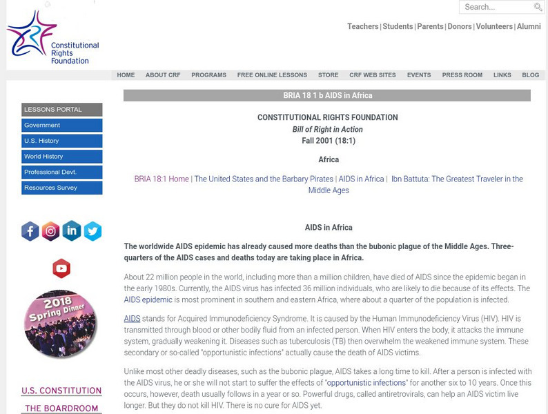 Activity-based resource on the AIDS epidemic and Africa. Students answer a set of questions for discussion and participate in an activity in which they analyze the literature and make recommendations as if from the U.S. State Department....