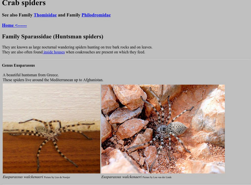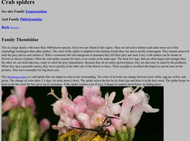 This resource contains information on the Thomisidae family and offers plenty of pictures. Includes a section on the mating habits of the Genus Xysticus.