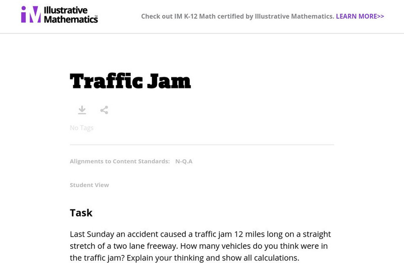 This task, codes to all three standards in this cluster, and also offers students an opportunity to practice modeling (MP4). Students must attempt to make reasonable assumptions about the average length of vehicles in the traffic jam and...