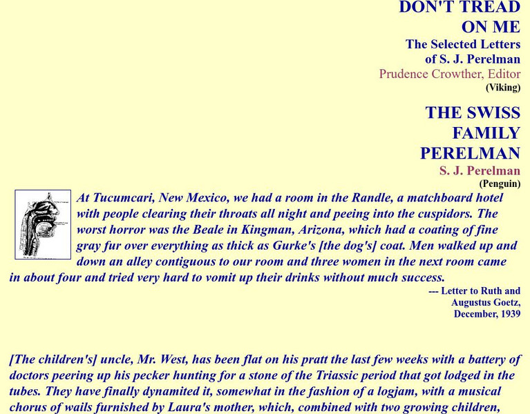 The text of some of the famous author's letters are given here. There is also commentary about the letters and the diminished quality of Perelman's writing in his later years.